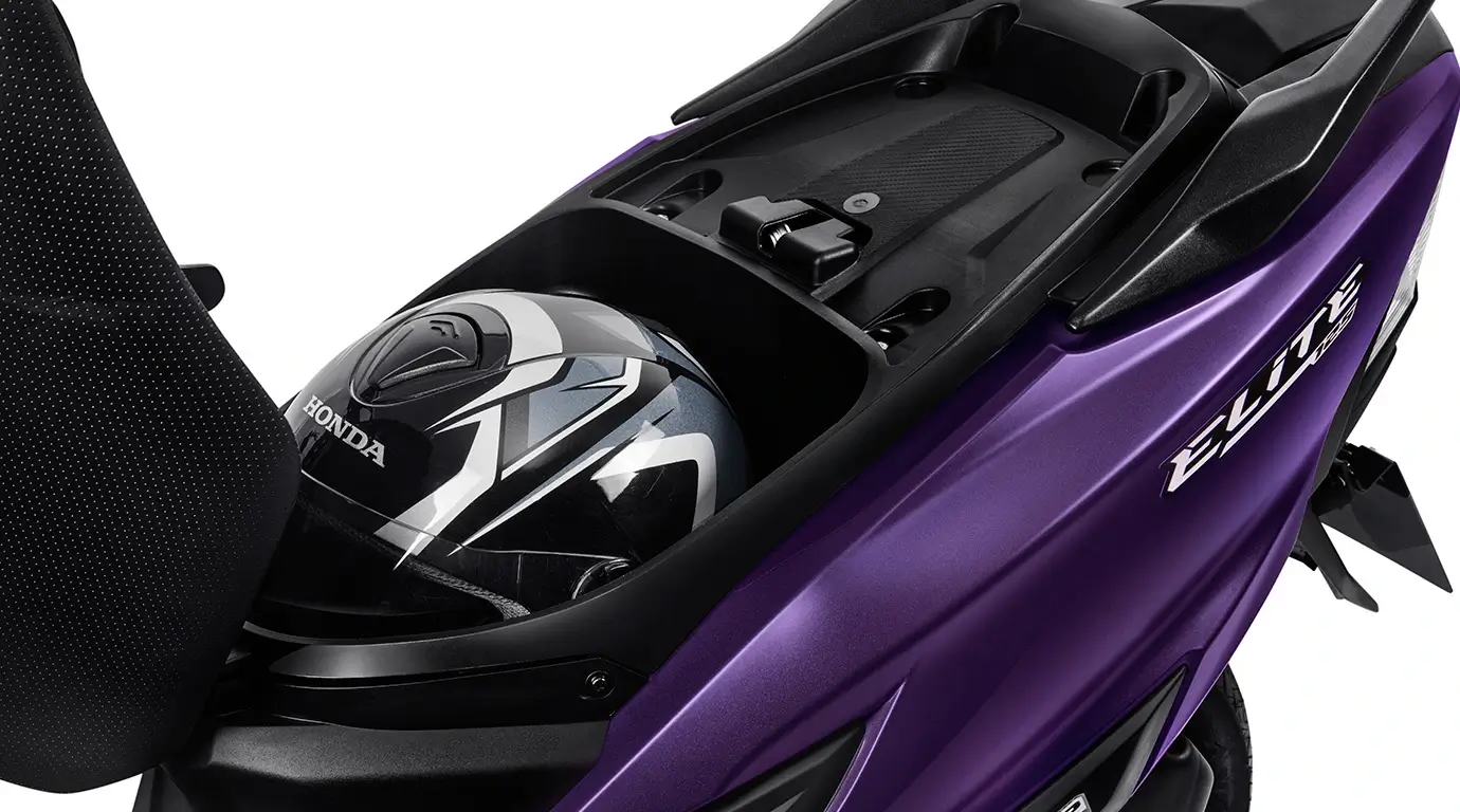 Com capacidade de 19,7 litros, o porta-objeto central da Elite125 agora possui uma maior capacidade volumétrica, permitindo acomodar com tranquilidade um capacete aberto, proporcionando comodidade.